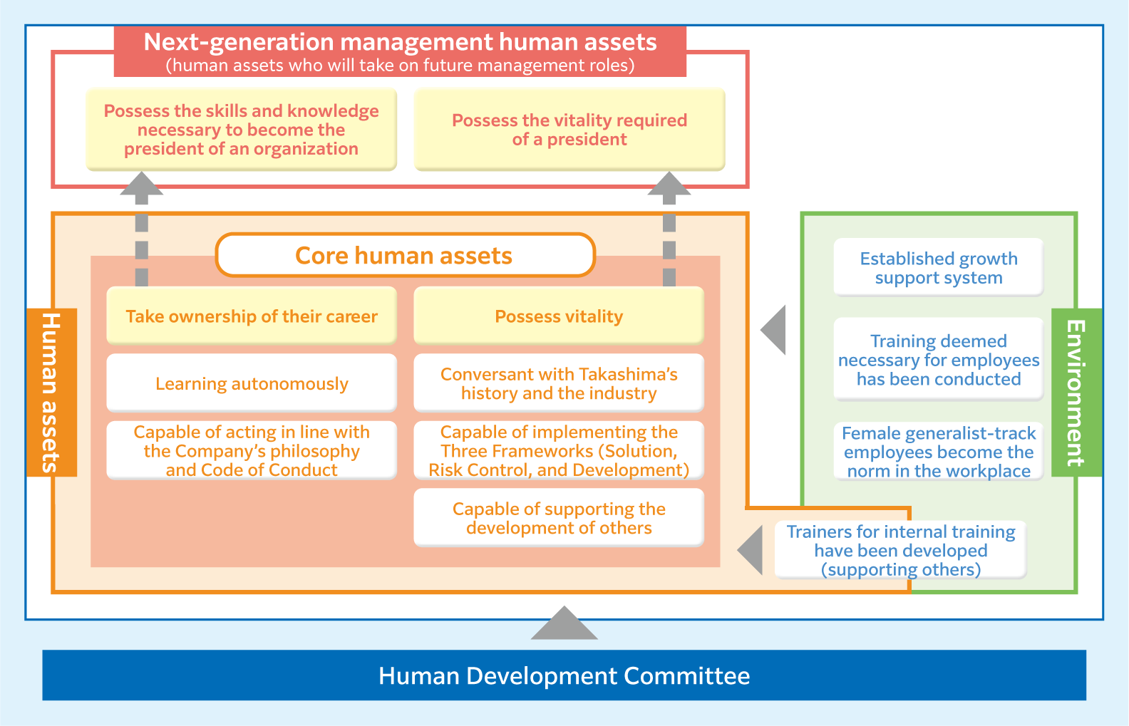 Human Development Committee ensures and verifies that training and other various measures are implemented in accordance with the human assets strategy and contribute to the development of human assets, and will support the systematic and standardized maintenance of the sustainability of training, etc., and the reproducible development of human assets.