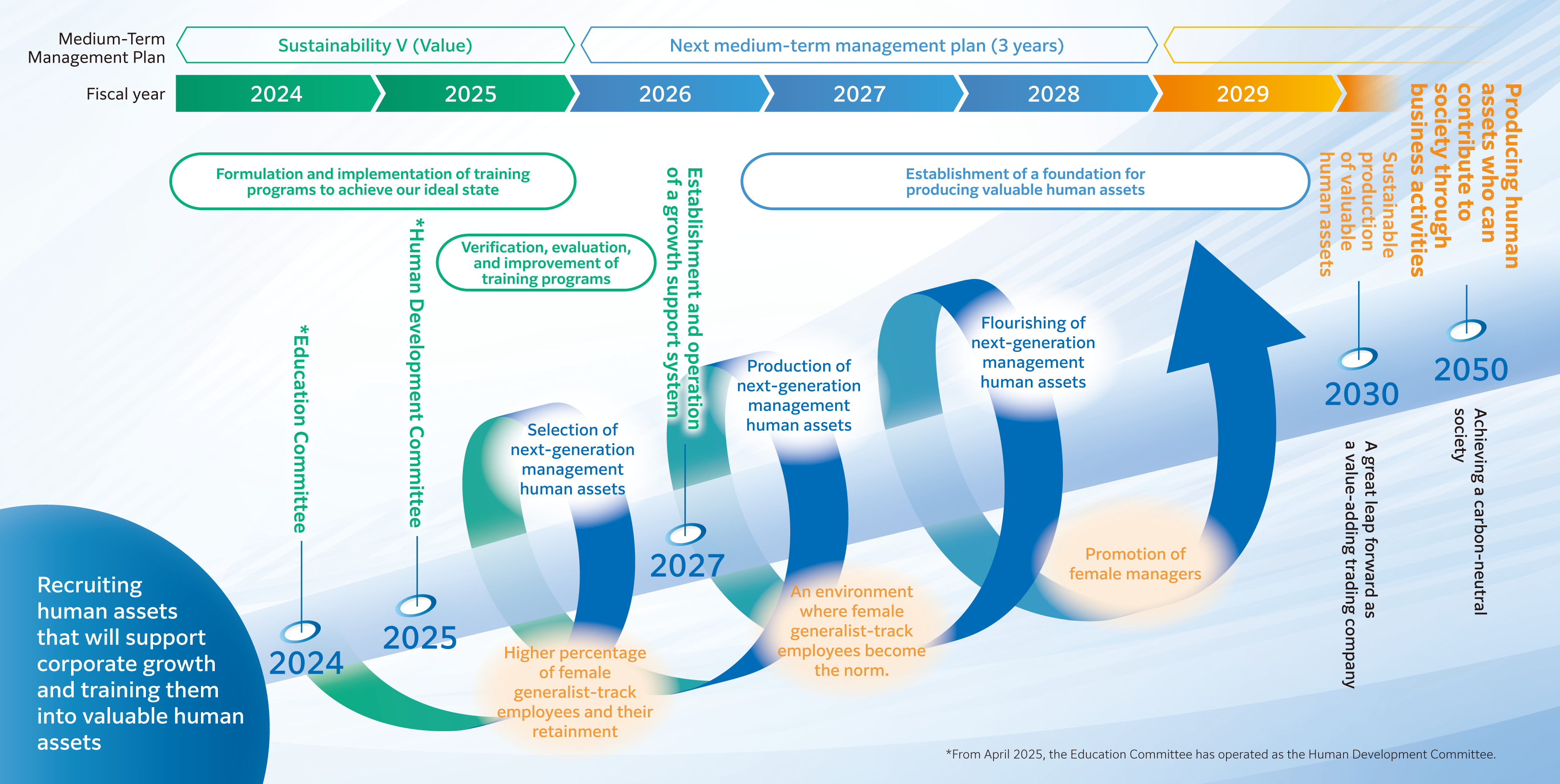 To promote our human assets strategy in the medium-term management plan, we launched the Human Development Committee on April 1, 2025. Human Development Committee aims to systematically support employee growth to improve overall organizational performance and efficiency, as well as to contribute to boosting employee motivation and engagement by establishing mechanisms that contribute to organizational growth and the retention of talent that the Company seeks.