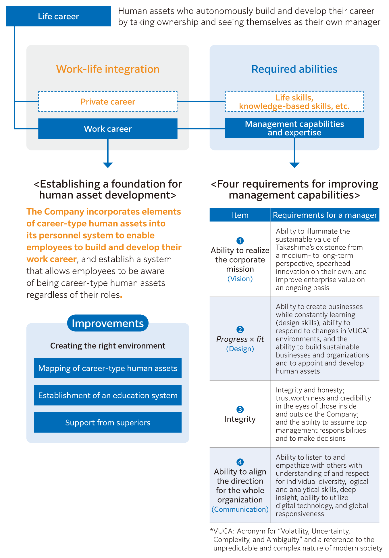 In our view, career-type human assets are human assets who take ownership of their own career, i.e., those who see themselves as their own manager. We believe that improving the abilities associated with the following four requirements,