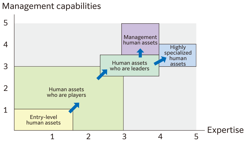 In order to support the growth of human assets, our most important capital, into career-type human assets (the type of human resources we seek), we have created a human asset classification map (a scheme that classifies human assets at the Company based on where they fall along the scales of “management capabilities” and “expertise” along the two respective axes) and fostered an environment where employees can proactively develop their own career visions. Employees can formulate a career plan by taking ownership of their own career and seek to achieve their career goals with the support of their superiors.