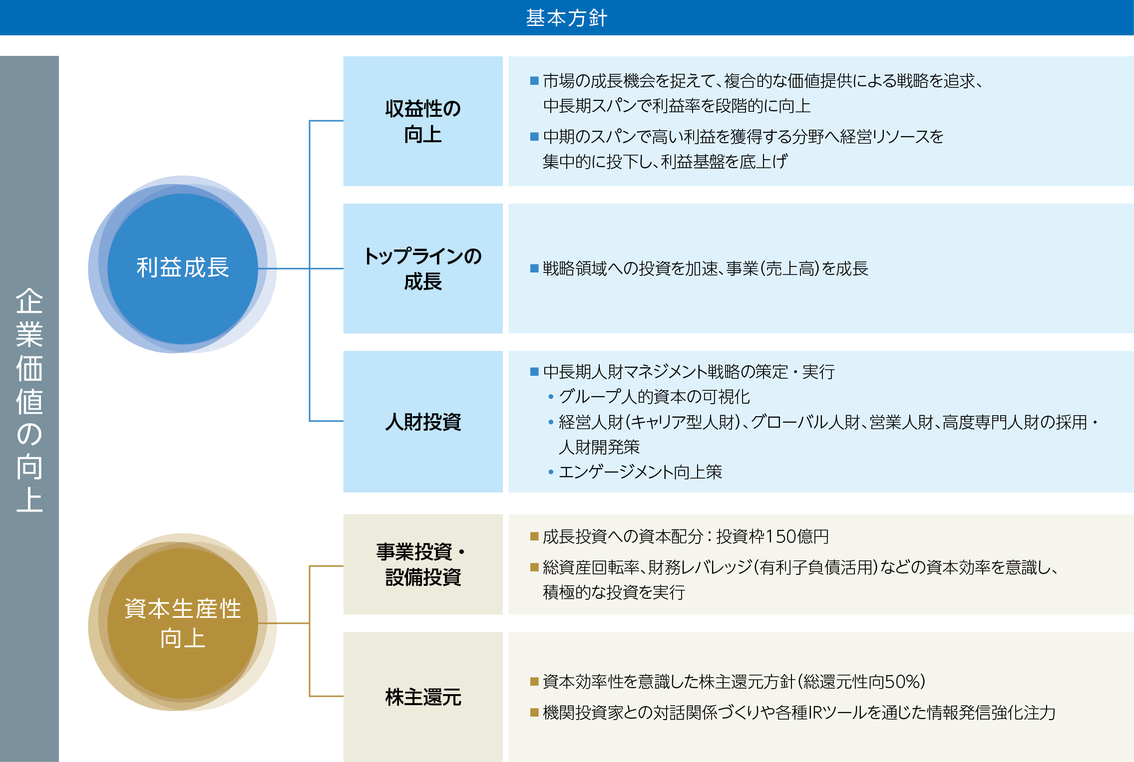 サステナVでは、市場の成長性と収益性の向上を鑑みた、事業ポートフォリオマネジメントを通じて収益性の向上を図り、利益成長を実現していきます。同時に、投資枠を150億円へと拡大し、積極的な投資を実行することや、資本効率性を意識した株主還元を通じて、資本生産性向上を実現することにより、企業価値の向上を目指していきます。