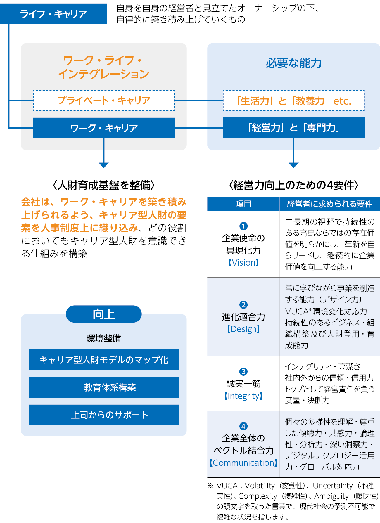 当社では、「キャリア型人財」は、自らのキャリアのオーナーシップを持つ人財、つまり自身を自身の経営者と見立てた人財であると考えています。当社として経営者に必要な要件と定めている下記4要件の力を向上させることが、キャリア型人財としての成長につながるものと考えています。
