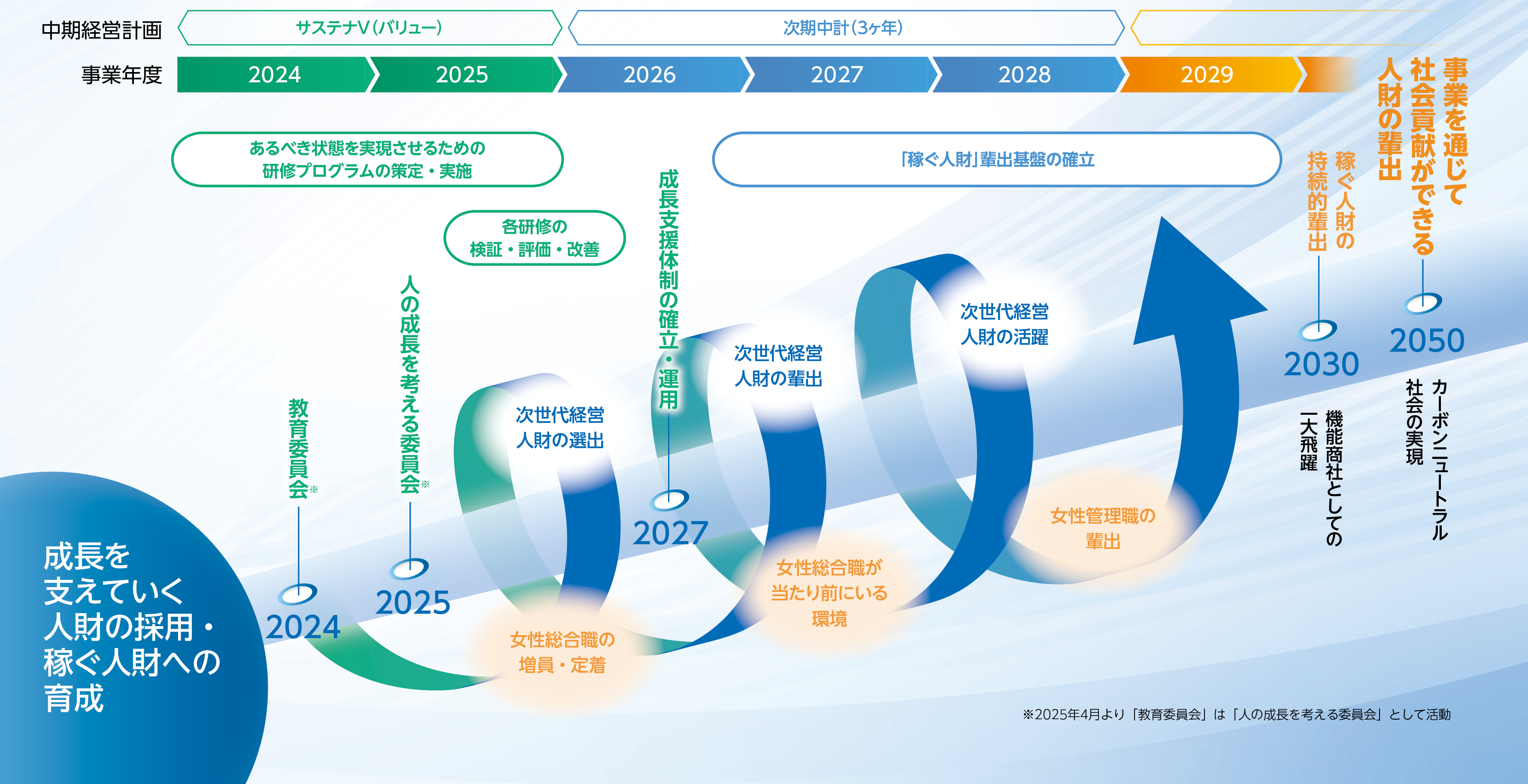 中期経営計画における人財戦略を促進していくため、2025年4月1日に「人の成長を考える委員会(通称:ヒセカイ2050)」を発足させました。ヒセカイ2050は、組織全体のパフォーマンス向上や効率化を実現するために従業員の成長を定型的にサポートし、従業員のモチベーションやエンゲージメント向上に寄与するために組織の成長と当社が求める人財の定着に貢献する仕組み作りを実現することを目的として活動していきます。
