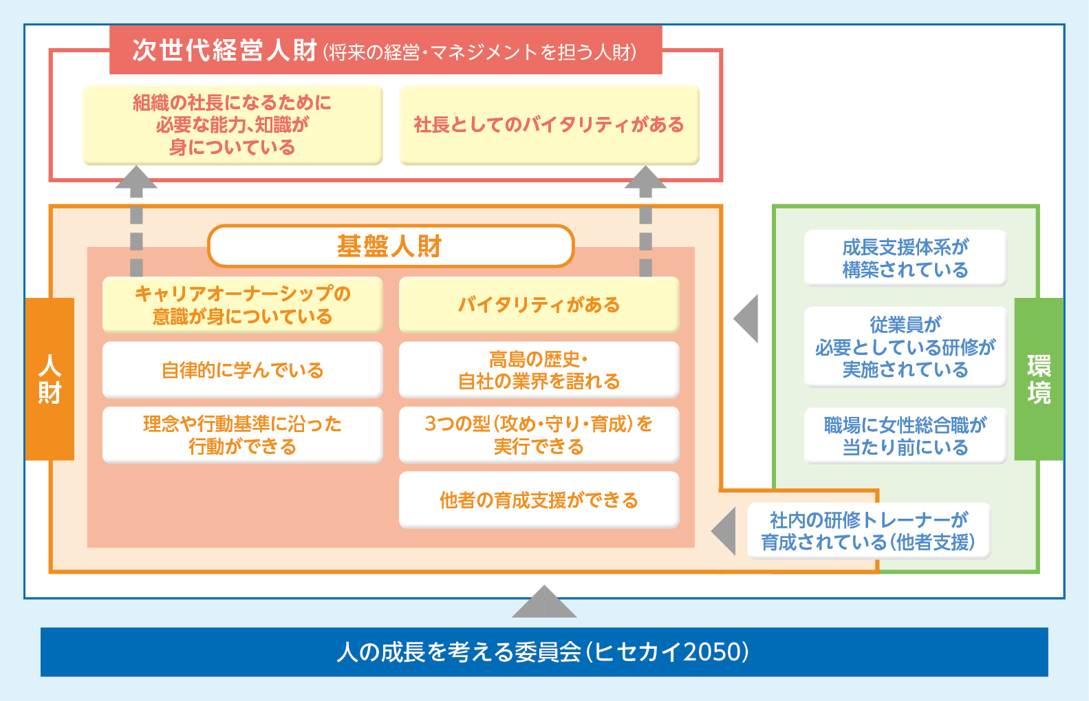 この度、当社におけるキャリア型人財への成長を推進していくため、スキルやマインド(人財要素)と、成長を支える当社の制度や風土(環境要素)の両側から「あるべき状態」を整理しました。事業の持続的成長を担う「基盤人財」を育成していくための「成長支援体系」を整備するとともに、企業価値の持続的成長を実現し将来の経営を担う「次世代経営人財」を輩出していくための「体制の構築」を進めています。